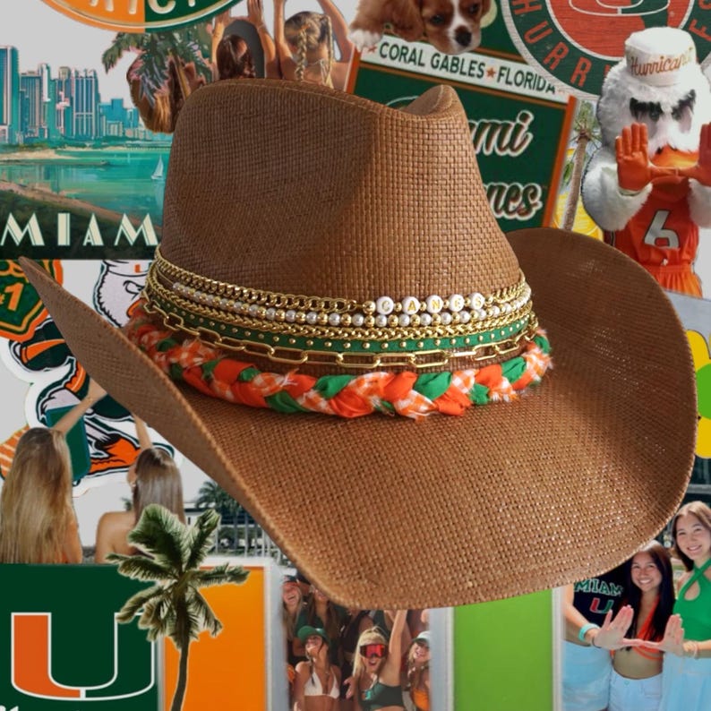 Represent The U in style with this stunning cowboy hat in iconic Orange & Green. Perfect for tailgates, game days at Hard Rock Stadium, and showing off your Miami Hurricanes spirit wherever you go!